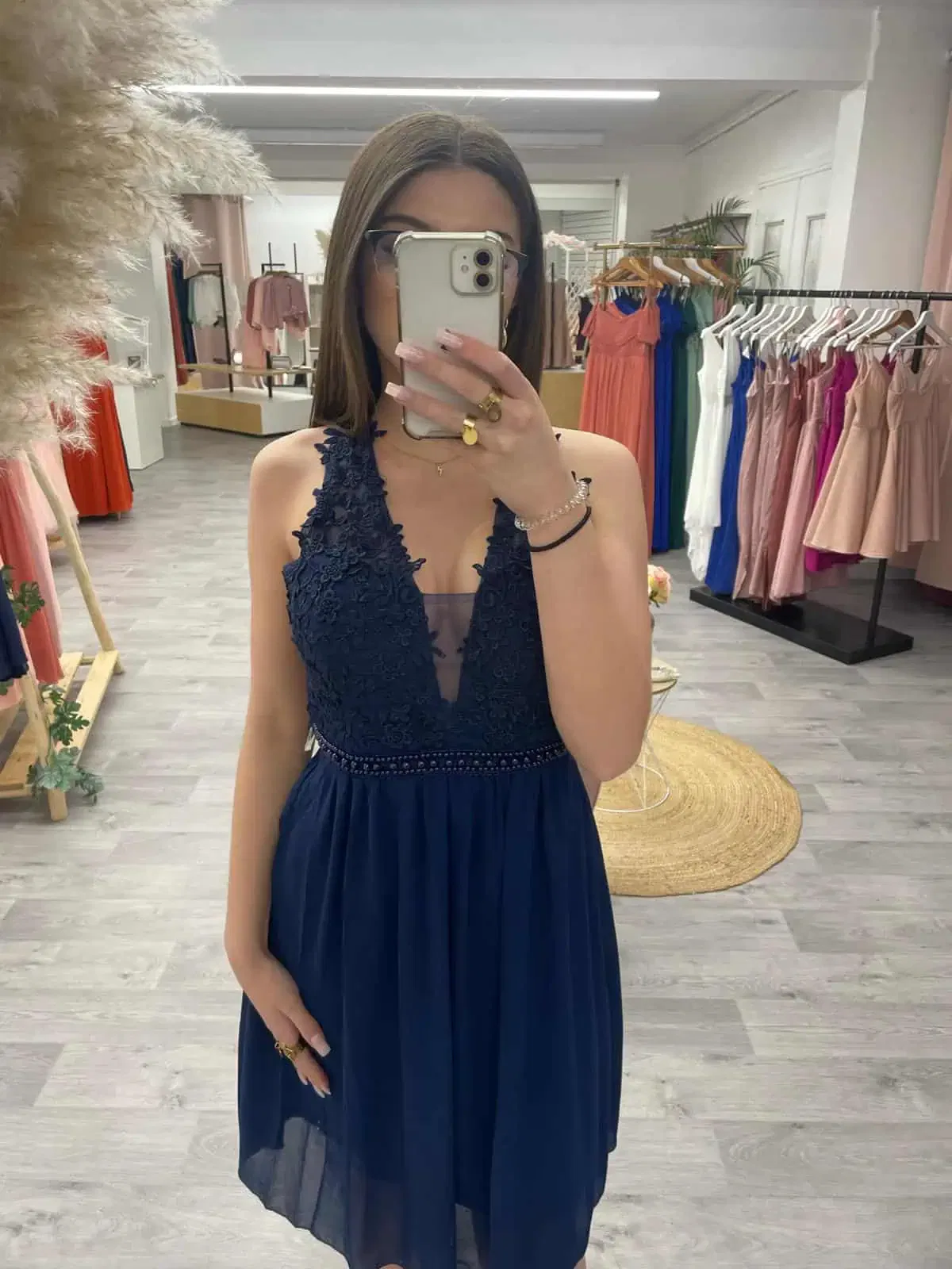 Une robe de cérémonie courte élégante chez Ottana. Elle s’arrête au-dessus du genou. Bustier perlé dos nu. taille S, M ou L