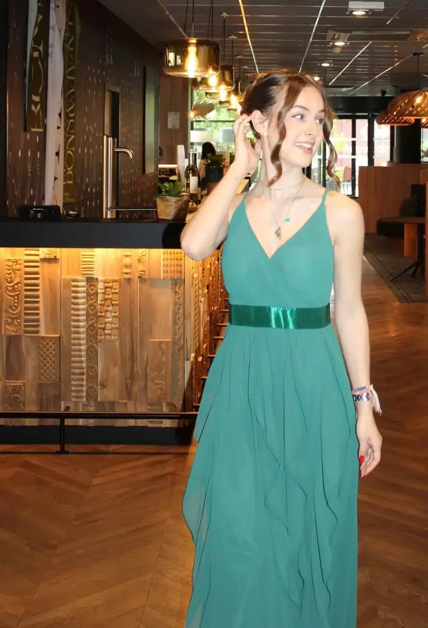 Robe de cérémonie verte sapin avec ceinture satinée Matière mousseline Fermeture au dos de la robe et brettelles croisées au dos