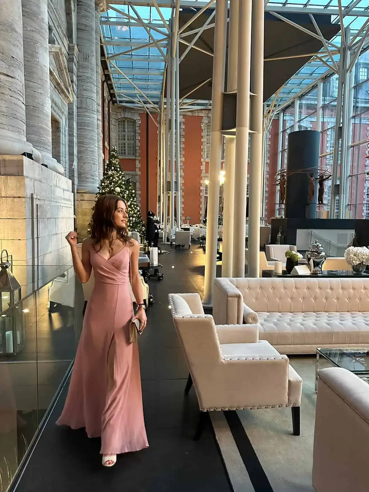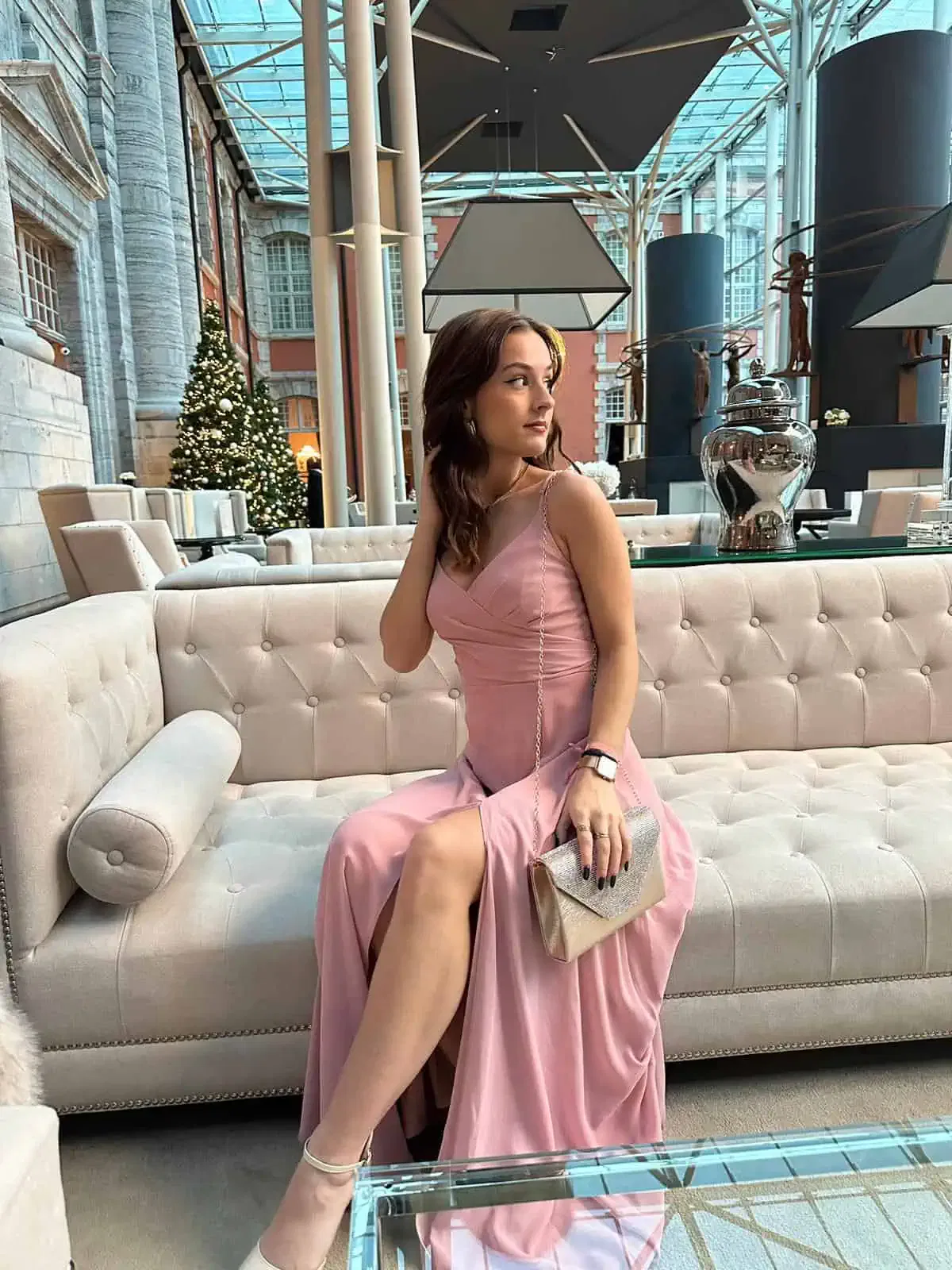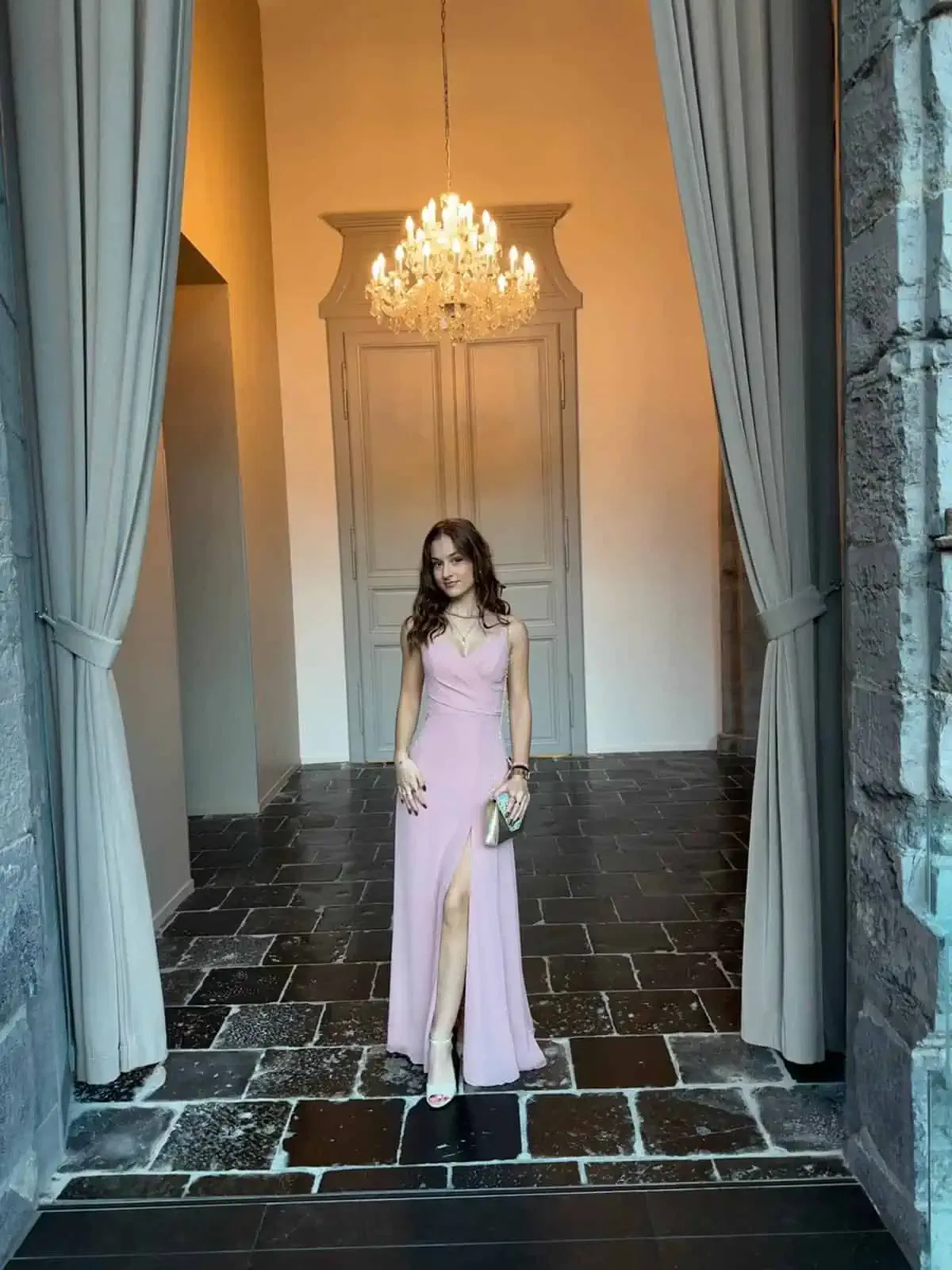 Une robe longue de cérémonie rose poudré avec une fente est une robe élégante et simple , parfaite pour des occasions spéciales.